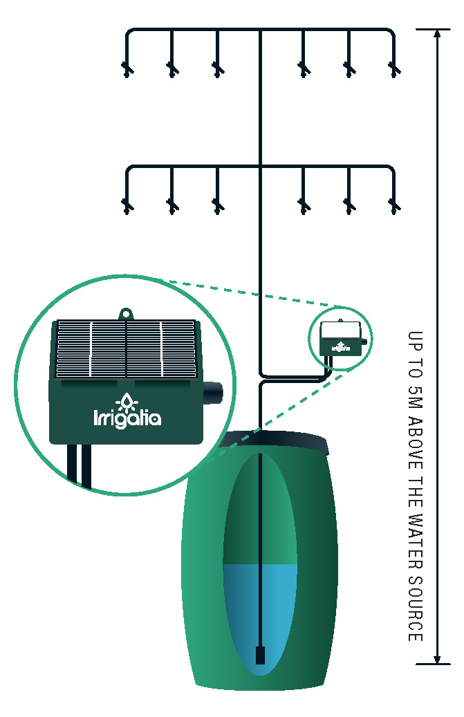 Once set up, you may never need to pick up your watering can again! Don't worry if your rain barrel isn't in a sunny location. The maximum run of tubing can be 60 meters and the pump can be located up to 20 meters away from the rain barrel.